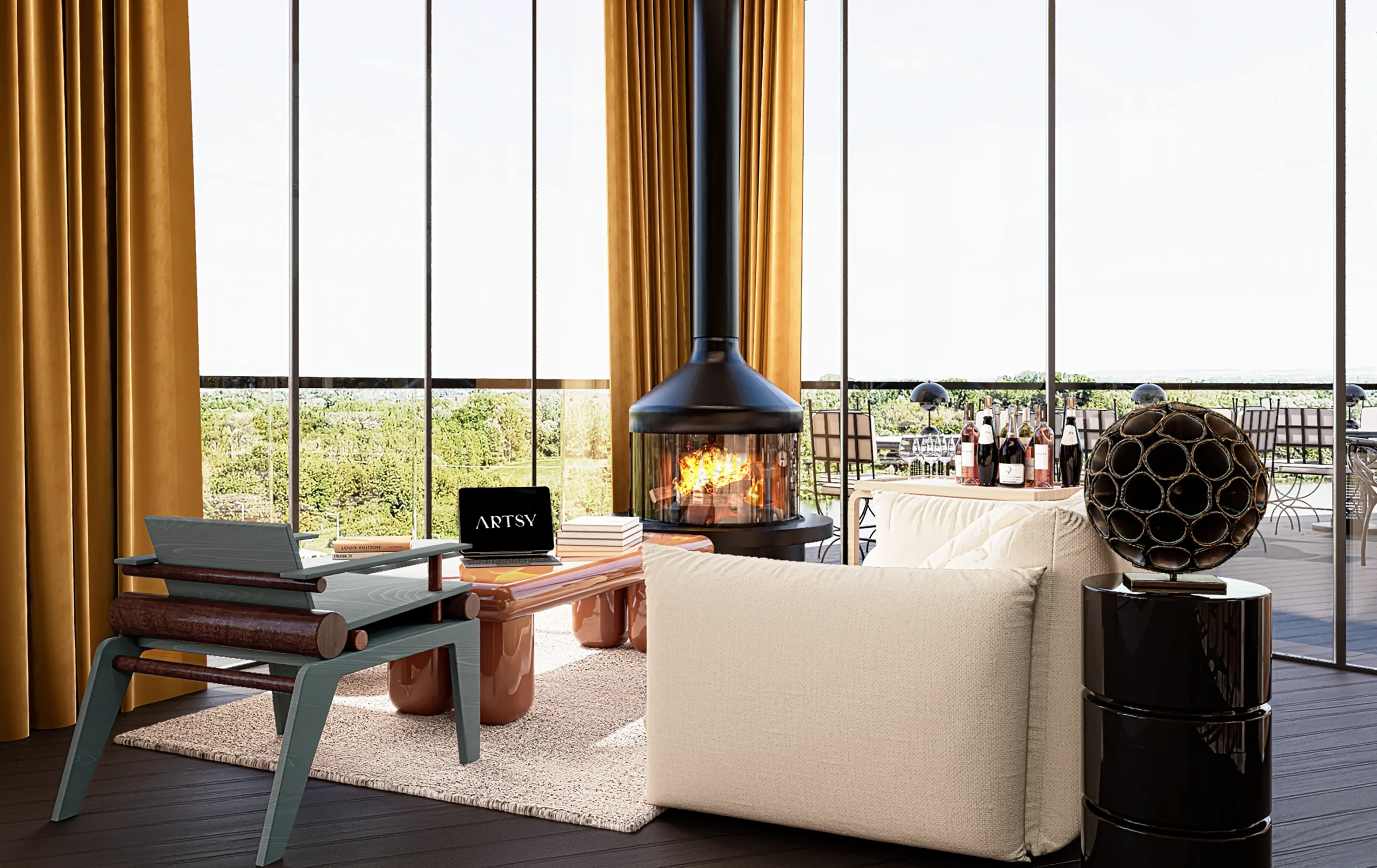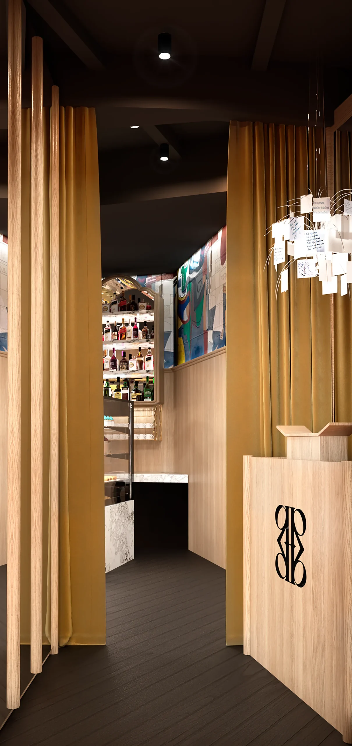 The artworks placed throughout the venue contribute to its artistic identity while also hosting special and talented artists. From the moment you step inside, the BURĒAU team has meticulously considered every detail to ensure you feel transported to another world. The fireplace situated in the corner brings the warmth of the fire indoors, creating a comfortable and homely atmosphere for guests. The centrally located bar and amphitheater serve as the heart of socialization, fostering connections. With a rich selection of music and high-quality beverages, the specially designed furniture branded by BURĒAU adds vibrancy to the space